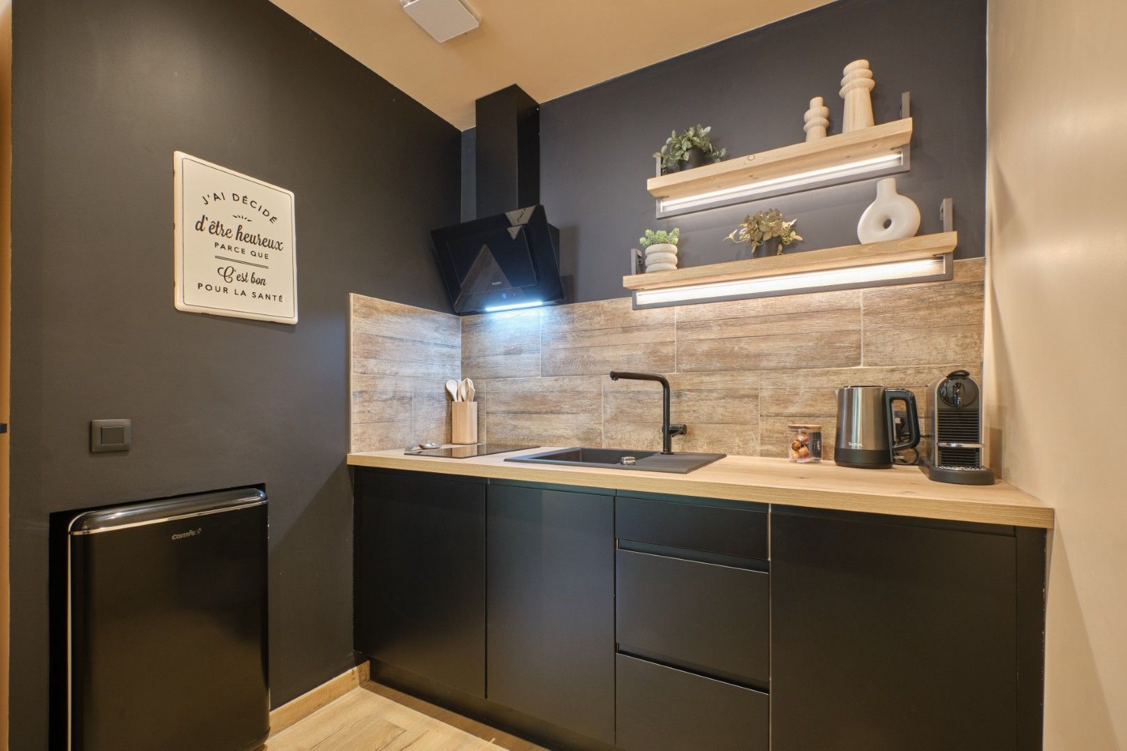 The small kitchen is very well equipped with a fridge, coffee machine, and everything needed to feel at home. The shower is pleasant, the bed is large and extremely comfortable, and every detail seems carefully chosen to provide a complete moment of well-being.